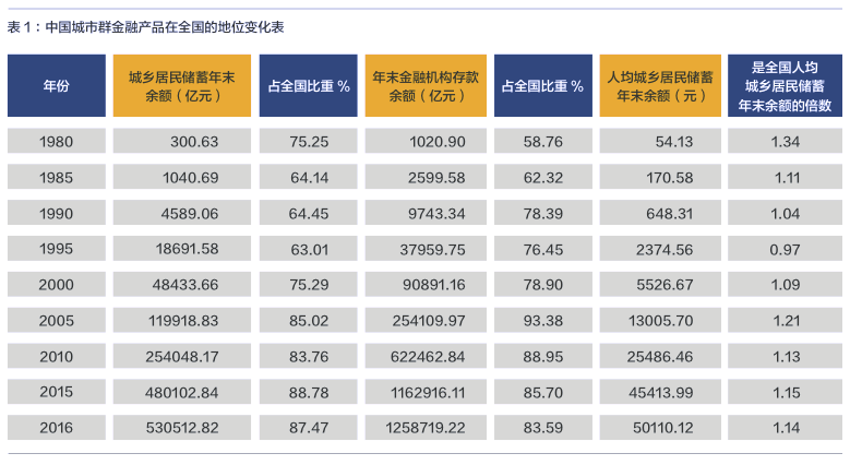 中國城市群是全國金融產(chǎn)品的匯聚地,集中了全國約85% 的存款余額,具有強(qiáng)勁的聚財(cái)效應(yīng)。從1980-2016年的36年間,中國城市群的城鄉(xiāng)居民年末儲(chǔ)蓄存款余額由300.63億元增加到530512.82億元,占全國的比重由75.25%增加到87.47%;年末金融機(jī)構(gòu)存款余額由1020.9億元增加到1258719.22億元,占全國的比重由58.76%增加到83.59%(表1),聚財(cái)效應(yīng)越來越顯著;人均城鄉(xiāng)居民儲(chǔ)蓄年末余額由54.13元提升到50110.12元,是全國人均水平的1.14倍。