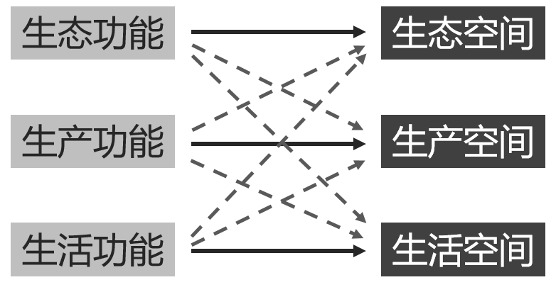 由此可見,“三生空間”的功能具有復(fù)合性,“空間”與“功能”之間存在“多對多”的復(fù)雜關(guān)系,即一類空間包含多種功能。在多種功能中又存在主導(dǎo)功能(圖2),例如生態(tài)空間中以生態(tài)功能為主導(dǎo),同時存在著生產(chǎn)與生活的其余附加職能。這種同一功能分布在不同空間,同一空間對應(yīng)著多種功能的多對多關(guān)系,需要著重厘清。