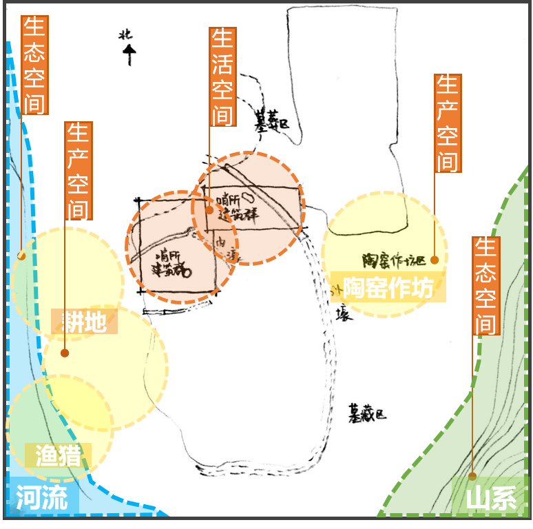 從中國傳統(tǒng)城市建設(shè)中我們可以挖掘出“三生空間”的特點(diǎn)、演化機(jī)制與內(nèi)在關(guān)系。我們的先輩為了生態(tài)安全、生活保障與穩(wěn)定的定居,非常重視“三生空間”的選擇與匹配關(guān)系。這種重視首先體現(xiàn)在歷史遺址中。在西安半坡村遺址(圖9)中,白鹿原可遮擋風(fēng)寒并提供林木,既是主要的生態(tài)功能空間,也是重要的生產(chǎn)空間;河流是生態(tài)空間,同時可提供農(nóng)耕用水與漁獵等生產(chǎn)功能;居住空間以壕溝為主,形成穴居群落外,還提供了制陶區(qū)與墓葬區(qū)。因此,半坡村生態(tài)生活生產(chǎn)三者兼顧,同時三者協(xié)同并互相利用。正是因?yàn)榘肫麓逍纬傻倪@種高度耦合的穩(wěn)態(tài)關(guān)系,使得人居環(huán)境能夠持續(xù)穩(wěn)態(tài)的發(fā)展。在姜寨遺址(圖10)中我們也能發(fā)現(xiàn)同樣的現(xiàn)象。這便是先輩的營建智慧,揭示了“三生空間”三者之間的規(guī)律,對我們現(xiàn)在仍有非常大的啟示。