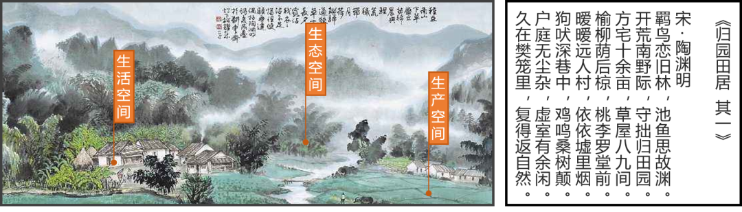 田園詩畫中,“三生空間”同樣有所體現(xiàn)。在中國傳統(tǒng)畫中,生態(tài)空間占比較大,比較夸張,而生活空間較少,體現(xiàn)了古人崇尚自然的思想(圖14、圖15)。一幅和諧畫作的根本是構(gòu)成要素的合理配置,即有什么產(chǎn)業(yè),有怎樣的生活,有何種的生態(tài),體現(xiàn)了“三生空間”的聯(lián)系度。田園詩歌中描述的場景也涵蓋了生產(chǎn)、生活、生態(tài)空間,以及其間的相互關(guān)系(圖16、圖17)。可以看出,田園詩畫并未強(qiáng)化三生空間的某一方面,而是重視三者間的有機(jī)協(xié)同。